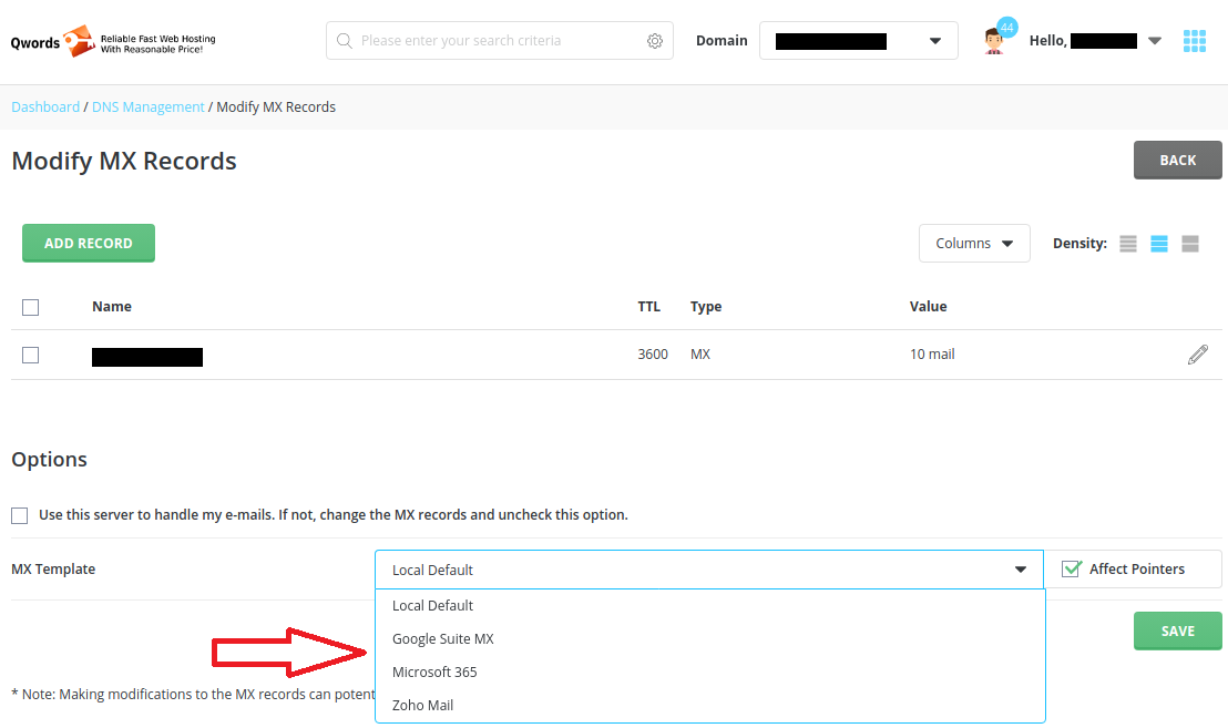 6. Pilih layanan email yang kita ingin gunakan di bagian MX Template.