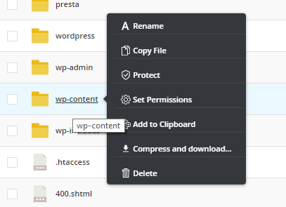 Untuk melakukan manajemen file atau folder, cukup langsung arahkan kursor mouse ke atas file atau folder yang diinginkan, maka akan langsung muncul menu: