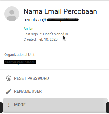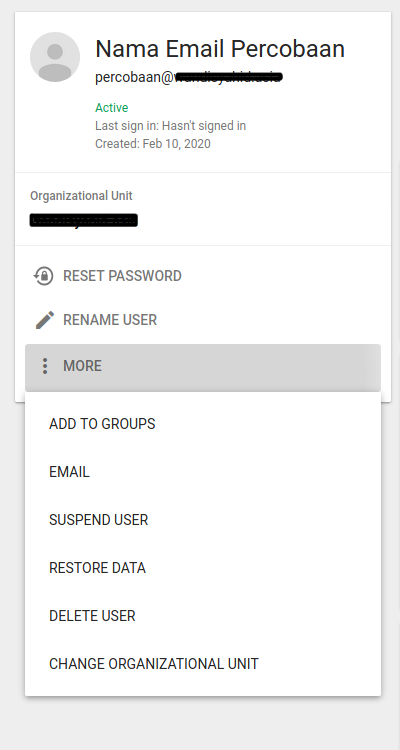 c. Lalu Pilih Menu More untuk melihat Menu lainnya seperti, Add to Group, Email, Suspend User, Restore Data, Delete User dan Change Organizational Unit