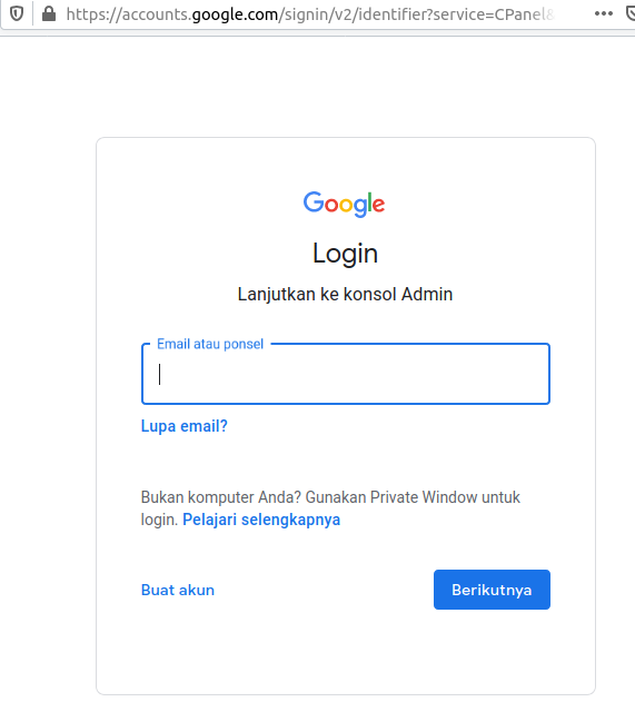 1. Seperti biasa, Kita login terlebih dahulu kehalaman Console Admin dengan mengakses https://admin.google.com/ lalu login menggunakan User email admin dan passwordnya