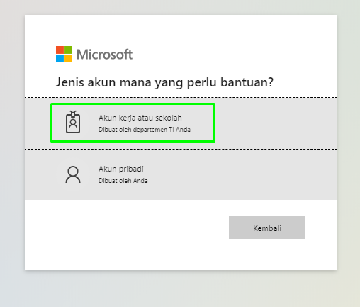 2. Klik pada Opsi pertama yaitu ” Akun kerja atau sekolah dibuat oleh departemen TI Anda”