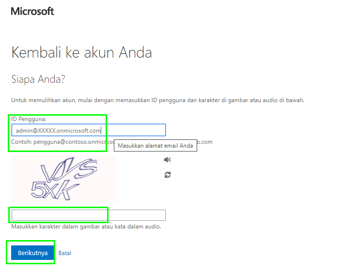 3. Selanjutnya masukan email microsoft yang sudah di informasikan, contoh : admin@XXXXX.onmicrosoft.com dan masukan kode security di kolom yang sudah disediakan