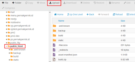 3. Pilih folder public_html di sebelah kanan. Lalu, klik Upload di bagian atas.