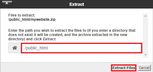 6. Masukkan /public_html di kolom yang tersedia. Lalu, klik Extract Files.