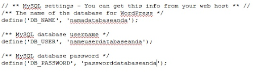 7. Ganti bagian nama database, user dan password dengan nama database dan user yang baru kita buat. Simpan perubahan file.