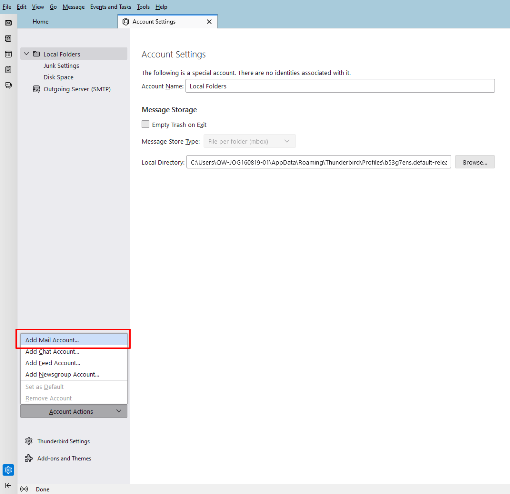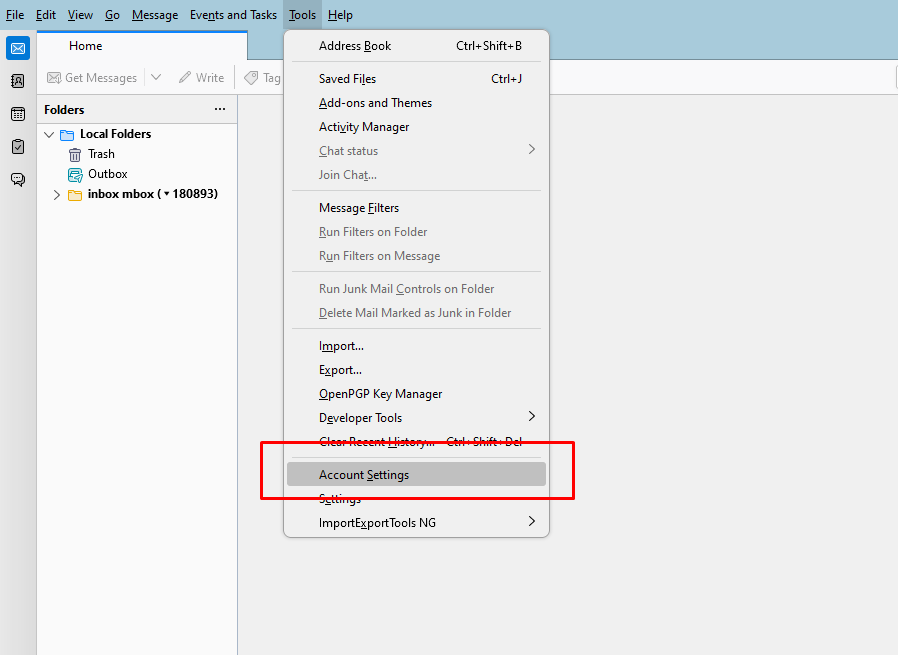 2. Masuk ke applikasi mail thunderbird -> Tools -> account settings