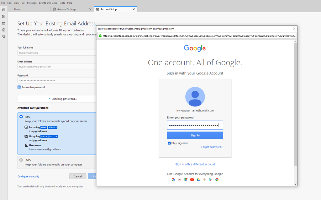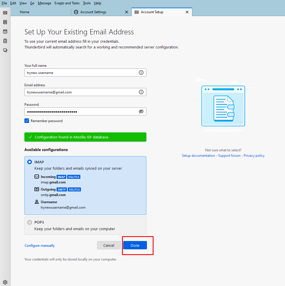 5. Setelah kita klik continue secara otomatis thunderbird akan menunjukan configurasi yang tersedia dalam hal ini kita menggunakan IMAP lalu klik Done