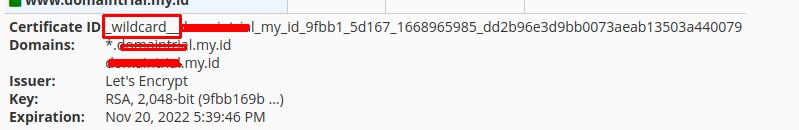 Langkah pengecekannya silakan masuk ke menu SSL/TLS -> Manage SSL sites. -> Certificate Details. Jika pada detail informasi Certificate ID menginformasikan wildcard maka dapat kami pastikan SSL yang dipergunakan sudah dengan type wildcard.