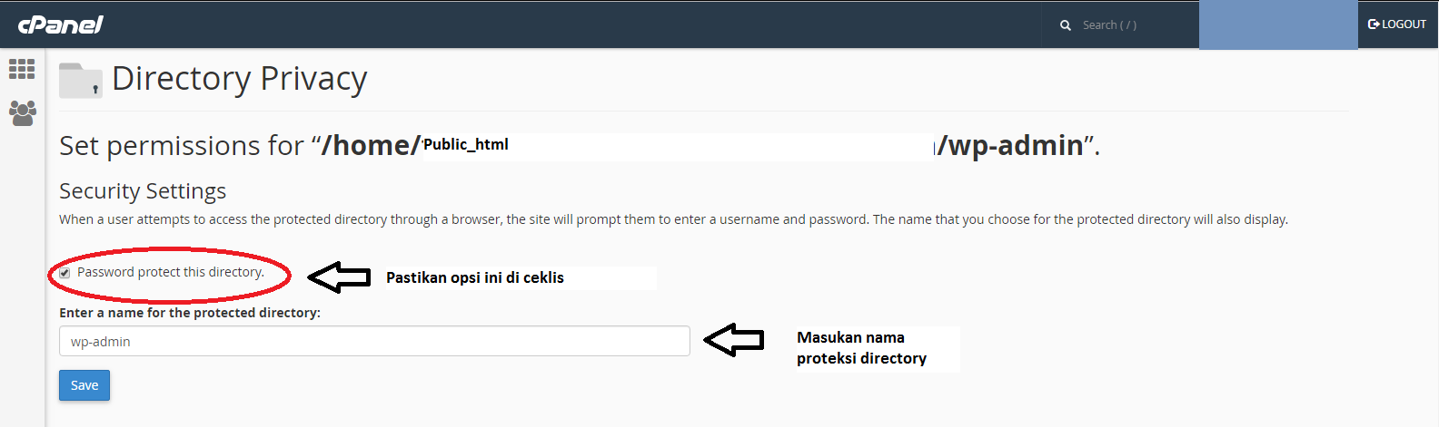 4. Masukan nama “Directory Privacy” yang ingin anda gunakan (Pastikan anda meng-ceklis “Password protect this directory.”) lalu save