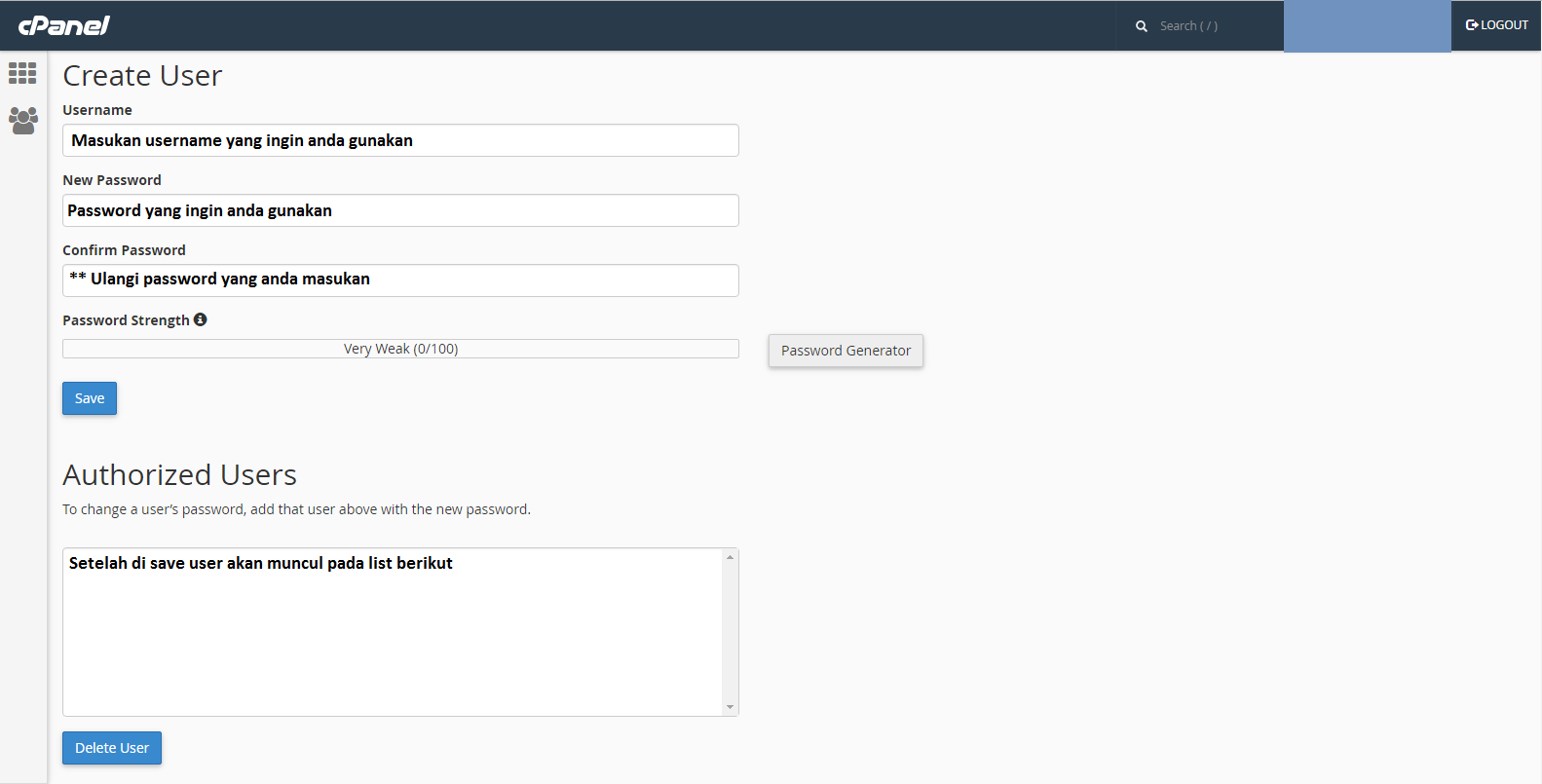 5. Create User yang ingin di gunakan sebagai akses ke “Directory Privacy” ( **PENTING!!! password yang di masukan tidak dapat direset/atau diketahui maka saat memasukan password direktori privasi harus dapat di ingat/disave) lalu save