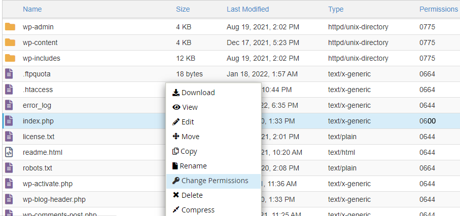 4. Misal, didapat file index.php mempunyai permission 600, dapat kita sesuaikan dengan klik kanan pada file tersebut -> pilih “Change Permissions” . Opsi lain, klik tombol “Change Permissions” di atas. (bisa juga multiple select file, checklist dulu semua file/folder yang akan dirubah permissionnya)