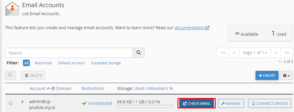 b. atau Sahabat Qwords juga bisa memilih Opsi lainnya dengan memilih menu “Check Email”  dihalaman ” Email Accounts”
