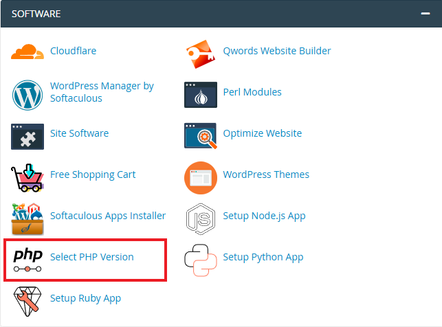 2. Pilih menu Select PHP Version di bagian Software.