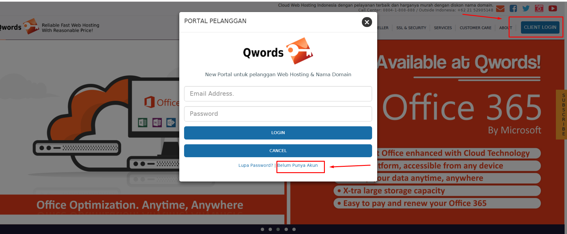 1. Langkah pertama, silakan akses Qwords.com. Klik tombol Client Login > Portal Pelanggan > Belum Punya Akun