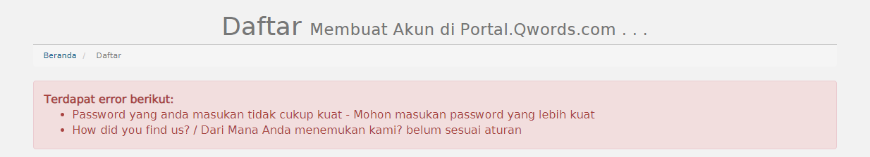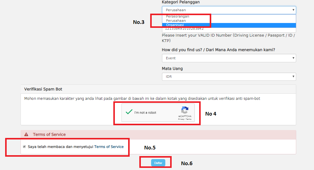 Jika terdapat Error seperti di atas, maka silahkan untuk merevisi error pada form terlebih dahulu, kemudian ulangi klik Verifikasi Spam Boat, Term of Service, kemudian klik Daftar.