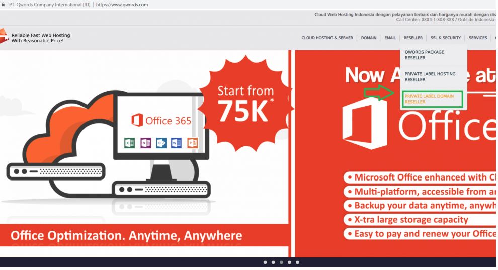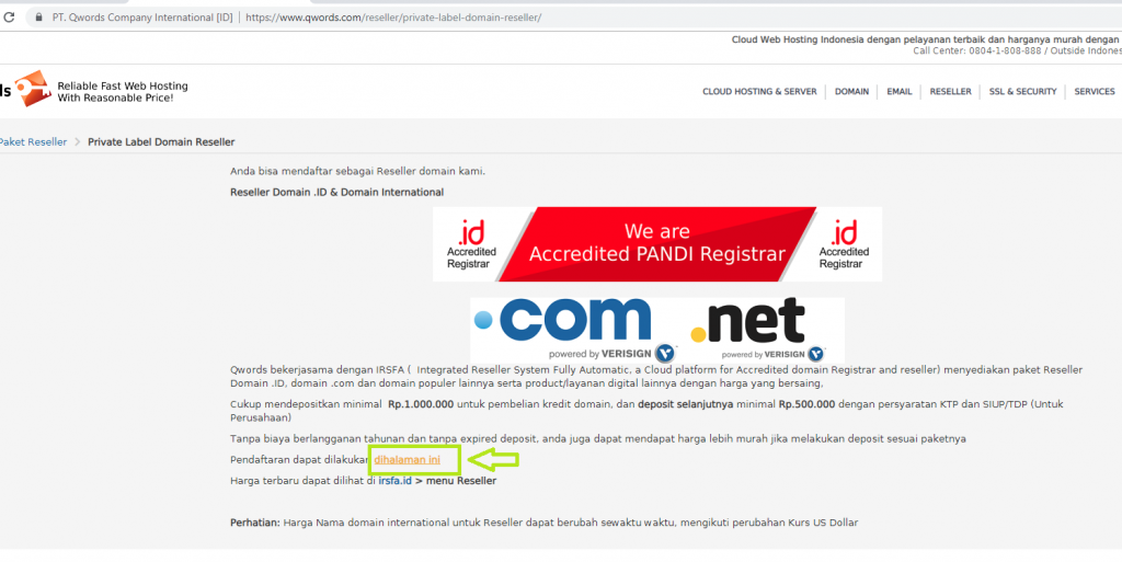 1. Kita akses terlebih dahulu website Qwords lalu pilih menu Reseller => Private Label Domain Reseller
