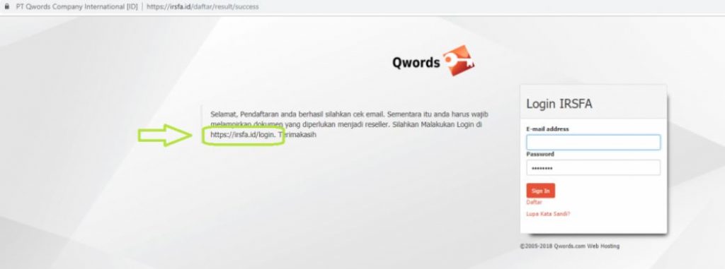 4. Setelah selesai register, kita bisa melanjutkan dengan login ke halaman panel Irsfa