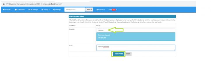 dan untuk cara mengisi depositnya kita login kembali dahulu ke panel Irsfa lalu pilih menu My Billing => add Funds