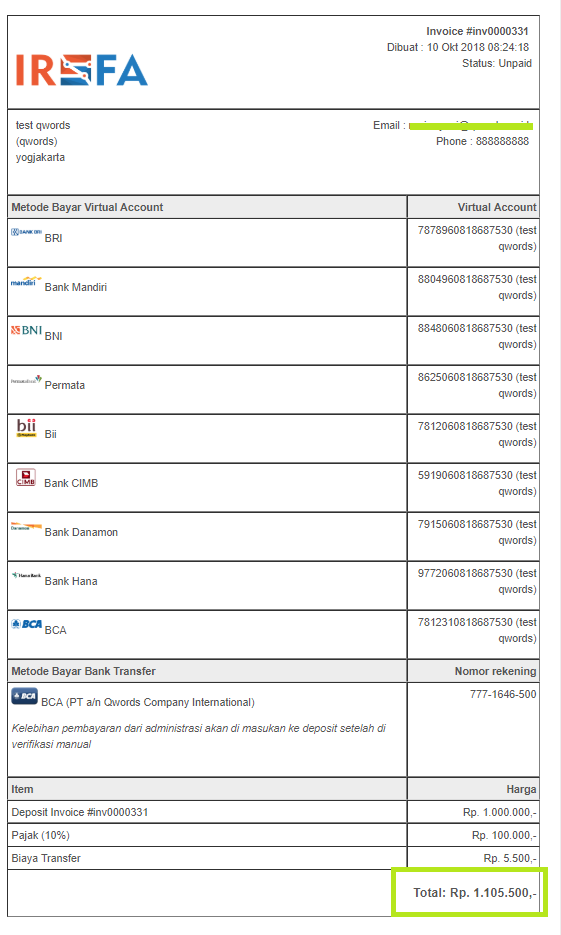9. Selanjutnya kita melakukan pembayaran sesuai dengan metode pembayaran yang kita pilih dan nominal pembayaran yang ada pada invoice, lalu konfirmasi ke tim billing kami via email billing@qwords.com
