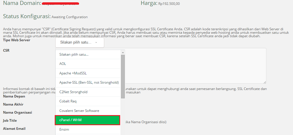 3. Pilih jenis server yang digunakan, jika menggunakan Cpanel, pilih CPanel/WHM
