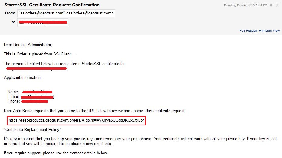 11. Tidak akan lama anda akan mendapatkan email bersubjek “Jenis SSL, Order Complete”, Contoh: