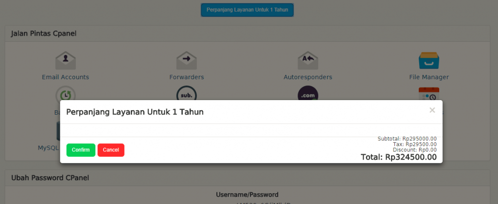 5. Lalu pop up akan menampilkan total biaya perpanjangan dan klik Tombol Confirm/Checkout untuk melanjutkan.