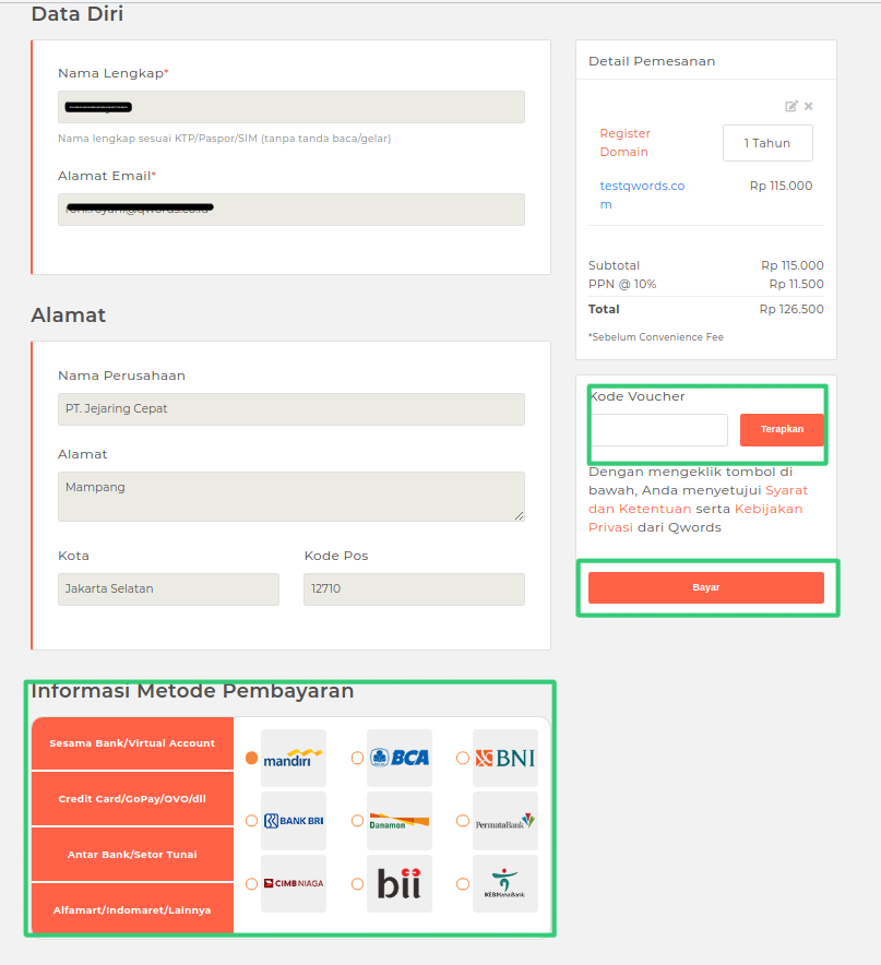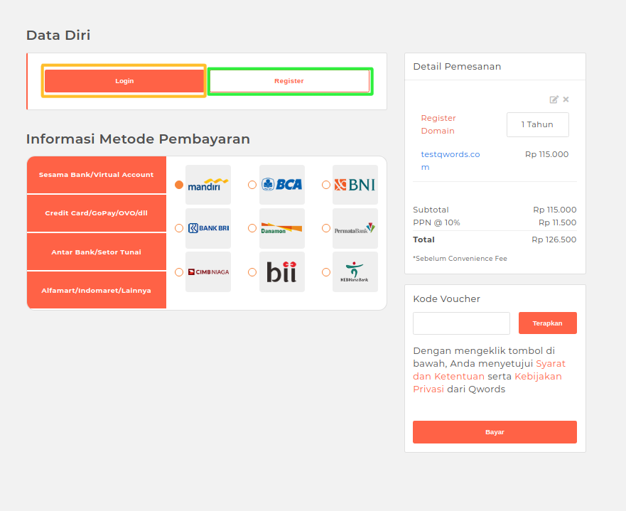 6. Jika sudah berhasil login, selanjutnya Pilih metode pembayaran sesuai yang Sahabat Qwords inginkan