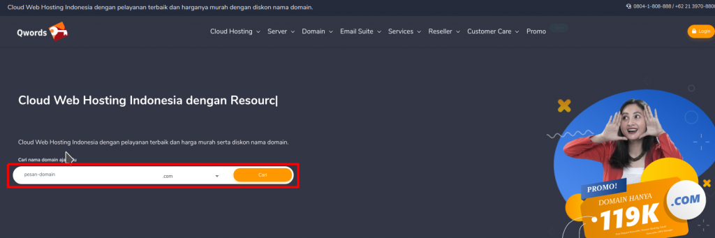 1 Untuk pemesanan nama Domain silakan buka website Qwords , lalu masukkan nama domain yang Sahabat Qwords inginkan lalu klik tombol Cari