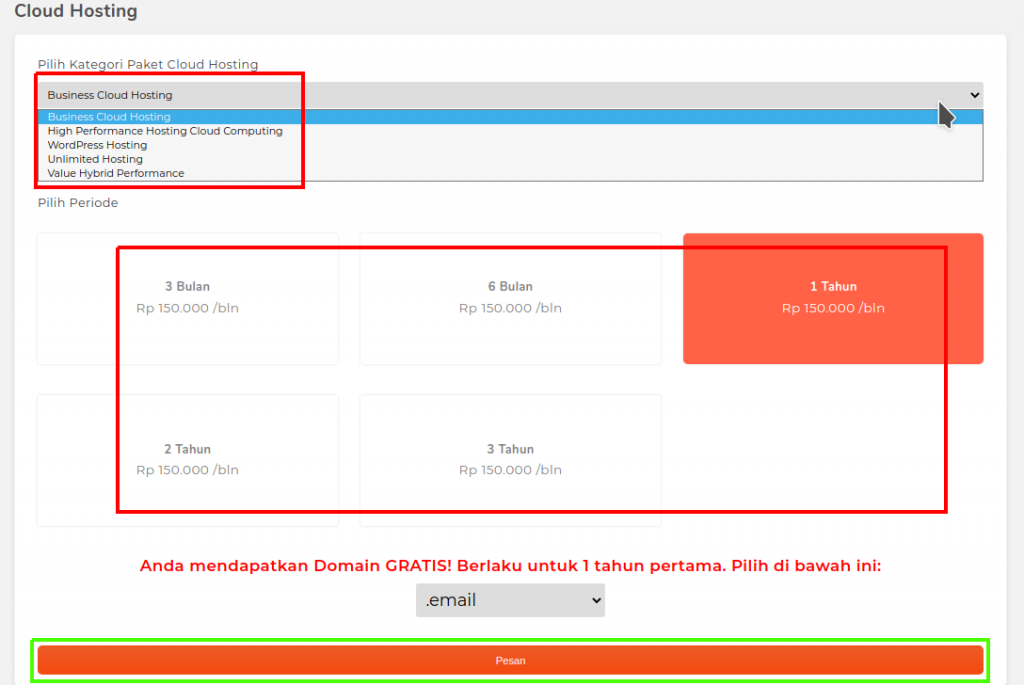 Lalu akan muncul detail kategori Paket hosting dan Pilihan periode untuk layanan hosting yang akan dipesan. Jika sudah memilih paket hosting yang sesuai, silahkan klik tombol Pesan untuk memasukan pesanan hosting ke keranjang belanja