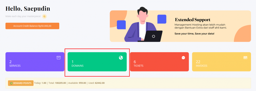 2. Setelah berhasil login, kita klik kolom domain untuk mengecek list domain yang kita miliki.