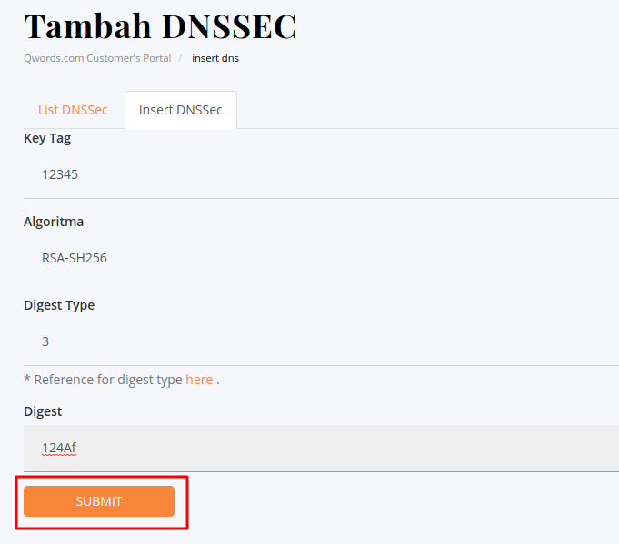Setelah kita selesai menginputkan informasi DNSSec, jangan lupa klik submit untuk menyimpan settingannya. Jika settingan DNSSec sudah berhasil di simpan, Sahabat Qwords bisa mengeceknya di List DNSsec.