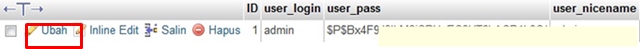 5. Pilih edit/ubah pada tabel wp_users