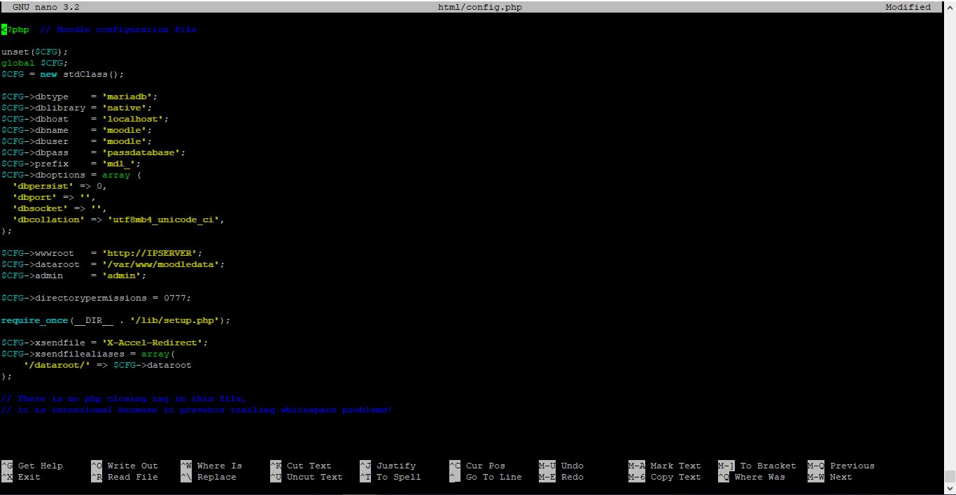 6. Sesuaikan file tersebut dengan direktori $CFG->dataroot = ‘/var/www/moodledata’;.