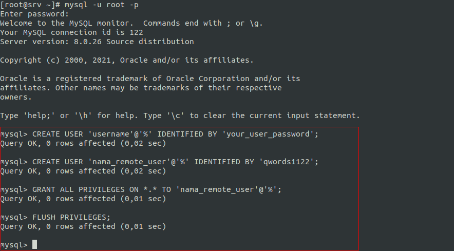 mysql> GRANT ALL PRIVILEGES ON *.* TO 'nama_remote_user'@'%';