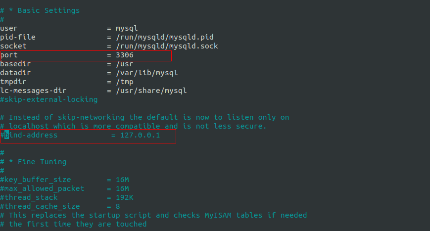Pada konfigurasi my.cnf kita dapat menghilangkan command pada port 3306, port ini digunakan server untuk akses remote database dan kita juga menambahkan command bind-address = 127.0.0.1 agar dapat diakses oleh IP address darimana saja. Kemudian kita dapat save dan exit konfigurasi pada my.cnf yang telah kita edit.
