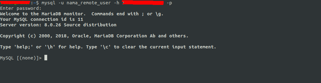 $mysql -u nama_remote_user -h (IP_Address_Server) -p
