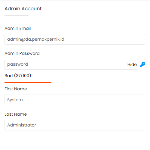 6. Di bagian Admin Account, masukkan alamat email, password dan nama akun admin di kolom yang tersedia.
