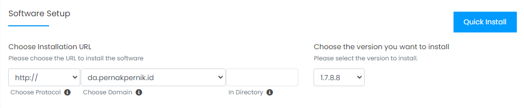 4. Di bagian Software Setup, pilih protokol dan domain yang kita inginkan. Lalu, kosongkan bagian In Directory untuk instalasi di folder home (public_html).