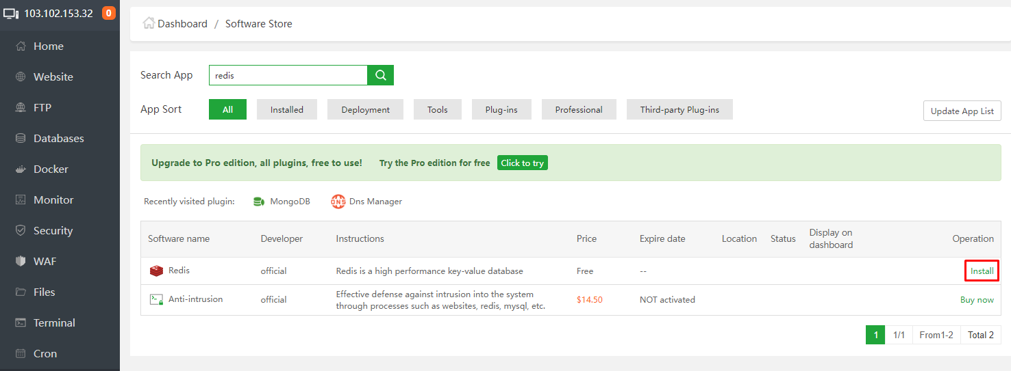 1. login aapanel dan masuk ke menu app store dan cari “redis”