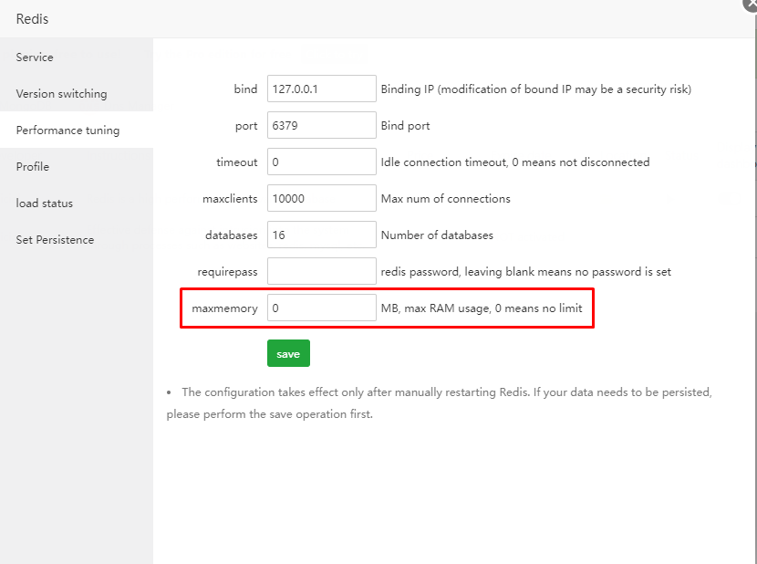 2. Pada halaman setting kemudian pilih tab performace tuning. Dari sini ktta bisa mengalokasikan besar RAM yang akan digunakan oleh redis atau tetap membiarkan 0 jika tidak akan dilimit
