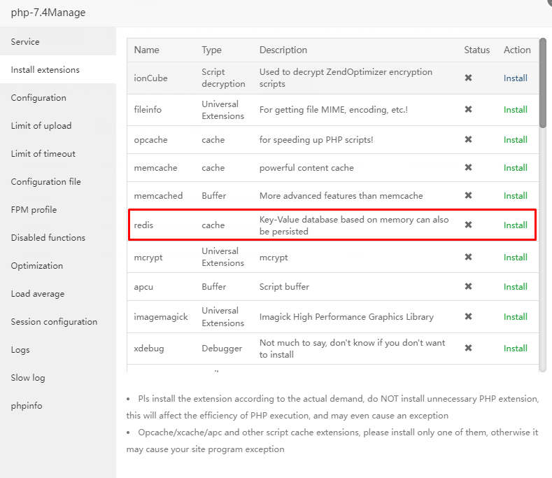 2. Pada Install Extension, pastikan redis statusnya centang. Jika masih tanda silang (x) perlu diinstall terlebih dahulu