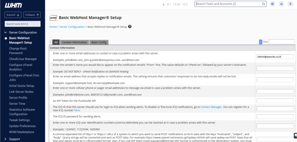 - Server Contact E-Mail Address (*) : email kontak apabila terdapat masalah di server. Alamat email bisa lebih dari satu, dan dipisahkan dengan koma (,)