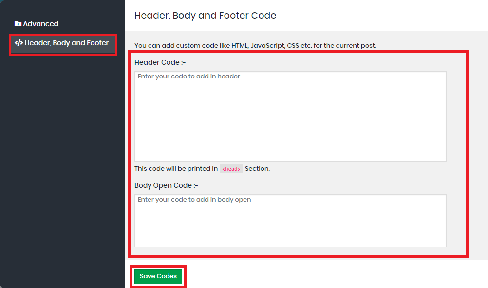 4. Akan muncul Advanced window, pilih tab Header, Body and Footer. Lalu, masukkan custom HTML pada bagian yang kita inginkan.