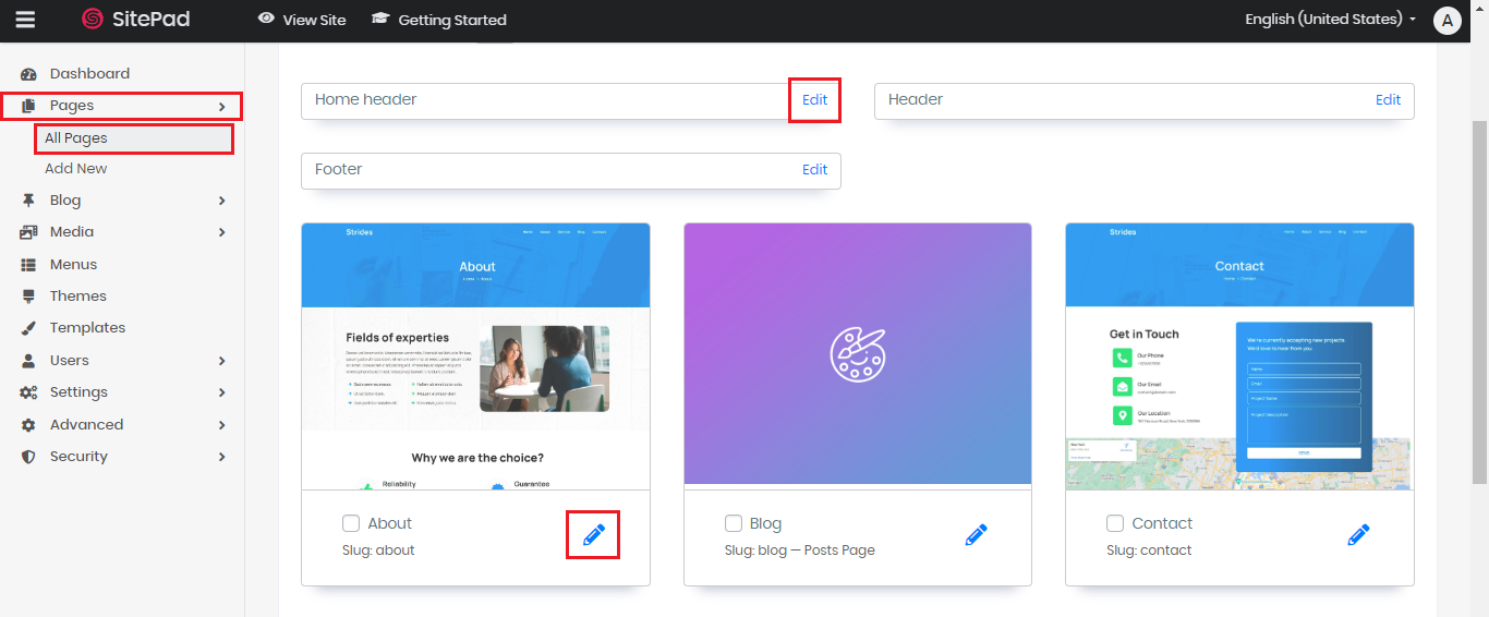 2. Pilih menu Pages > All Pages di sebelah kiri. Lalu, klik Edit atau icon pensil pada bagian atau halaman yang kita inginkan.