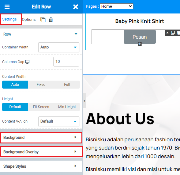 4. Pada tab Settings di sebelah kiri, pilih Background atau Background Overlay. Bisa pilih salah satu sesuai kebutuhan, ya.