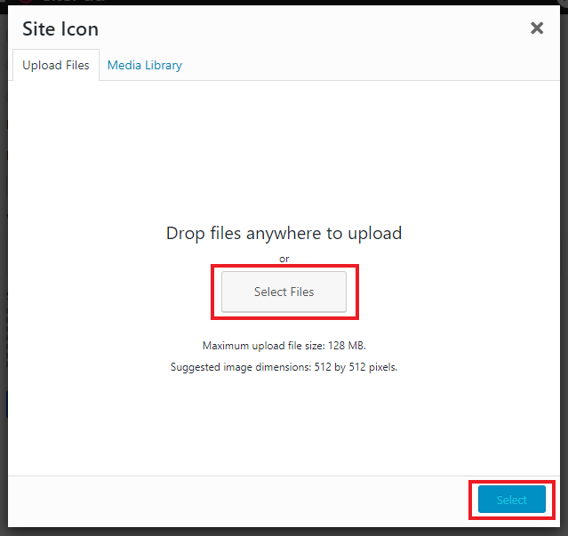 4. Klik Select Files di tab Upload Files dan pilih ikon website kita. Lalu, klik Select.
