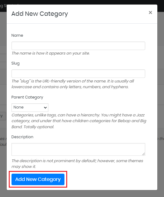 3. Masukkan nama kategori di bagian name dan slug URL-nya di bagian Slug. Lalu, pilih Parent Category dan masukkan deskripsi kategori di kolom yang tersedia.
