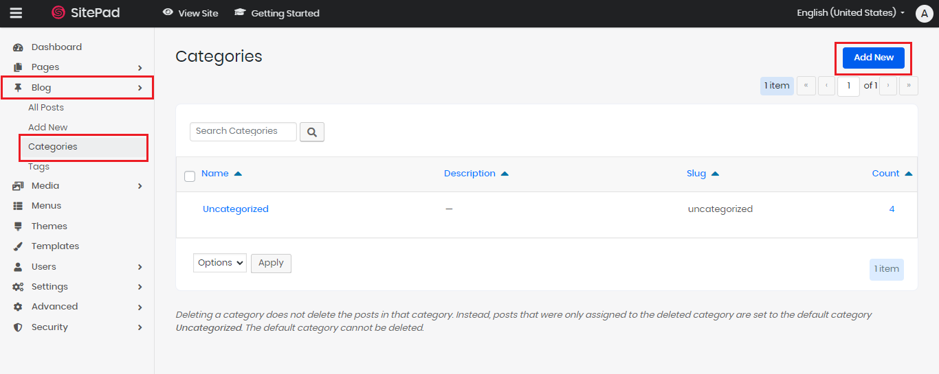 Kalau Sahabat Qwords lihat, di SitePad hanya tersedia kategori Uncategorized. Nah, karena itu kita harus menambahkan kategori yang baru lebih dulu nih di SitePad.