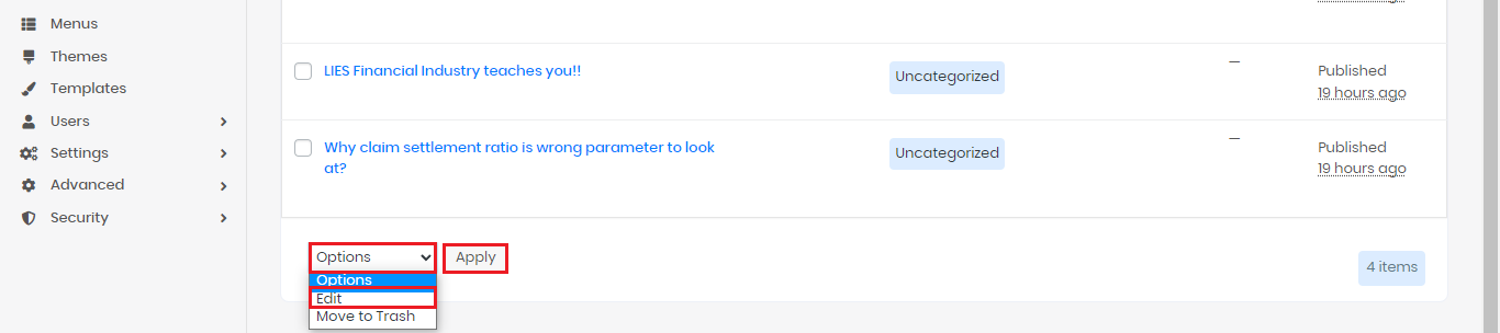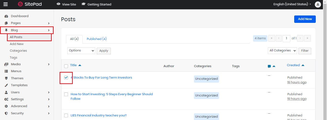 1. Pilih menu Blog > All Posts di sebelah kiri. Lalu, klik checkbox pada posting-an yang kita inginkan.
