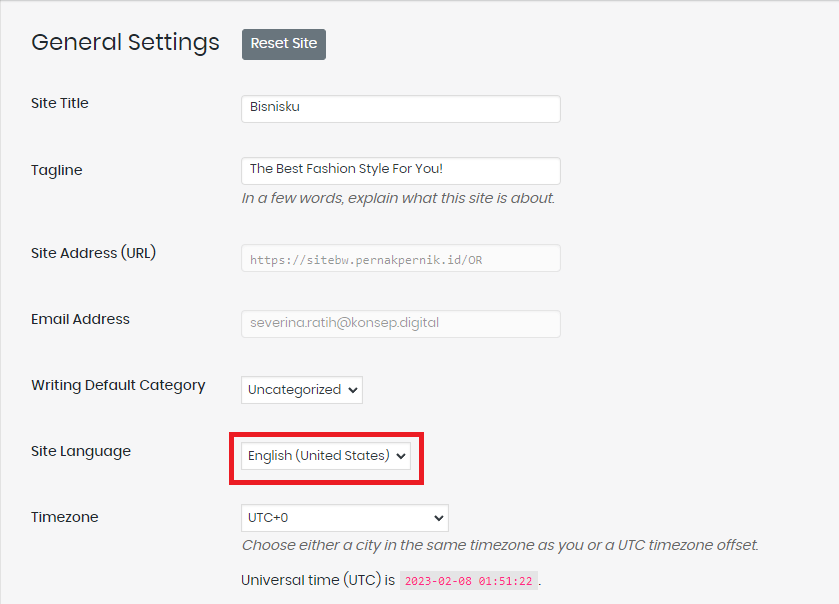 4. Cari bagian Site Language, lalu pilih bahasa yang kita inginkan untuk website. Untuk bahasa Indonesia, bisa pilih id_ID, ya.